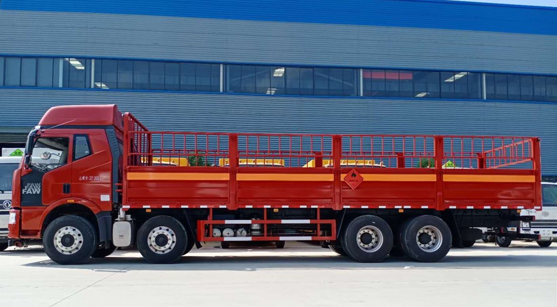 該車適用于運(yùn)輸危險(xiǎn)品為危險(xiǎn)貨物運(yùn)輸車。主要用于運(yùn)輸具有**容器(瓶)包裝的液化石油氣,丁烷,乙炔,乙烷,丙烷,丁烯,打火機(jī)或打火機(jī)加油器,二氧化碳,壓縮氧(氮,空氣,氦,氬,氖),類項(xiàng)號(hào):2.1,2.2。該車運(yùn)輸?shù)慕橘|(zhì)為2.1項(xiàng)易燃?xì)怏w時(shí),車輛采用”易燃?xì)怏w”標(biāo)識(shí)牌,運(yùn)輸?shù)慕橘|(zhì)為2.2項(xiàng)非易燃無毒氣體時(shí),車輛采用”不燃?xì)怏w”標(biāo)識(shí)牌。整車長/軸距/前懸/后懸對(duì)應(yīng)關(guān)系為(mm):11995/1950+4550+1350/1460/2685,11995/1900+4500+1350/1500/2745,11995/1900+4200+1350/1500/3045,11995/2**+4000+1350/1460/3085。僅采用底盤子午線輪胎和帶ABS的底盤,該車前輪安裝盤式制動(dòng)器,前置排氣管,裝配限速裝置,限速79km/h。安裝帶有衛(wèi)星定位功能的行駛記錄儀。專用裝置為固定用卡槽。側(cè)防護(hù)和后防護(hù)裝置材料材質(zhì)為Q23**碳鋼,側(cè)防護(hù)與廂體底部焊接連接,后防護(hù)裝置與車架采用焊接連接。后防護(hù)截面尺寸(mm):120×50,離地高度為470mm。采用發(fā)動(dòng)機(jī)型號(hào)CA6DK1-28E5,CA6DK1-32E51,CA6DL1-32E5對(duì)應(yīng)油耗值分別為油耗 (L/**km):43.71,45.5,42.09。ABS系統(tǒng)生產(chǎn)廠家:浙江萬安科技股份有限公司,型號(hào):VIE ABS-Ⅱ。隨底盤選裝駕駛室。后軸采用空氣懸架。 該車后軸為采用空氣懸架. |